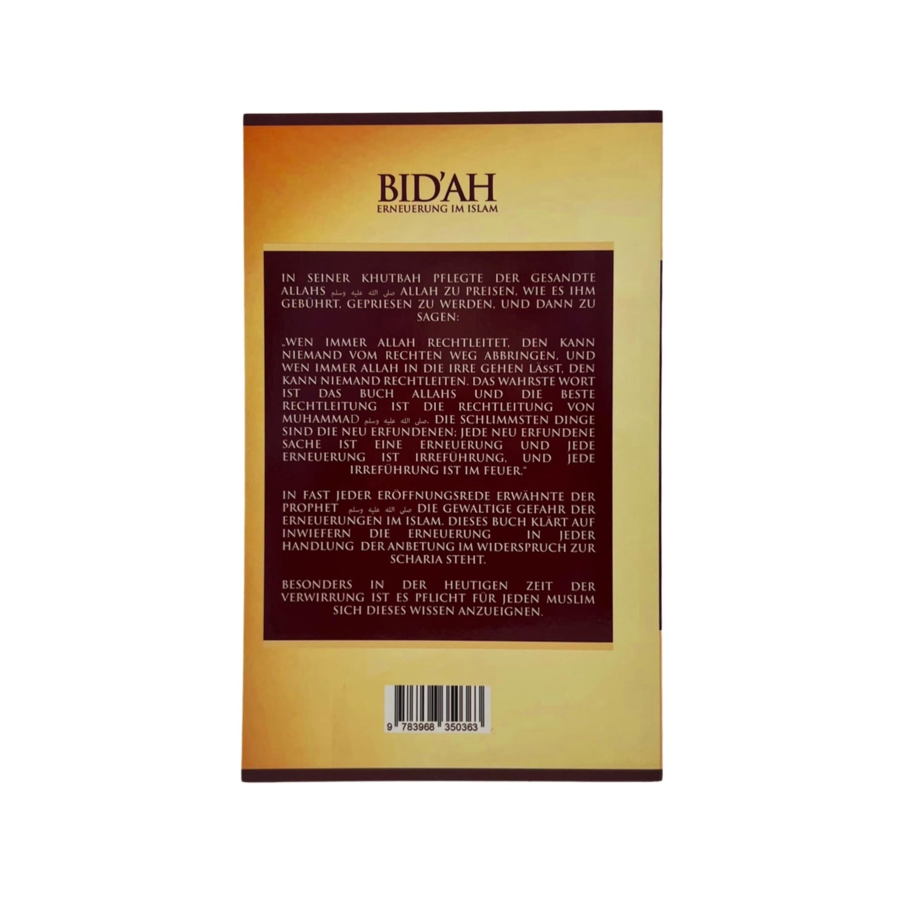Dieses Buch basiert auf den Werken bedeutender Gelehrter wie Ibn Taimiya, Ibn al-Qayyim, Ibn Radschab, Scheich al-‘Uthaimin und Scheich al-Munajjid. Es erläutert, warum jede Form der Erneuerung in den religiösen Handlungen im Widerspruch zur Scharia steht. Besonders in dieser Zeit der Verwirrung ist es unverzichtbar für jeden Muslim, dieses Wissen zu erlangen.